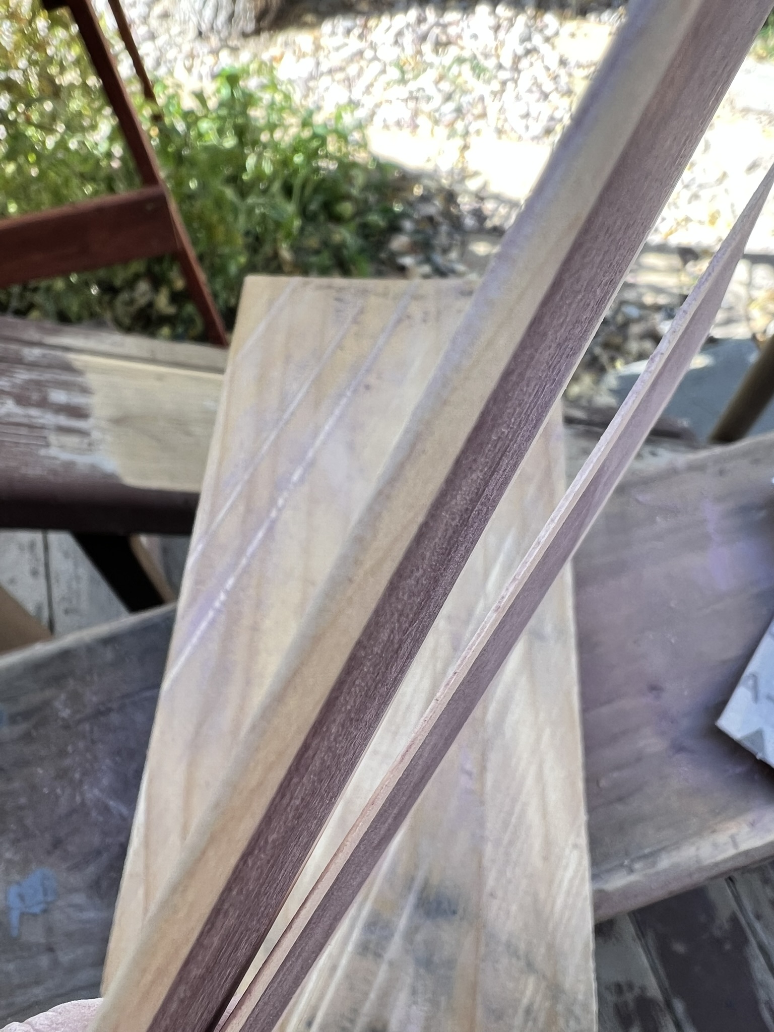Anyway, I used a homemade thin-strip rig to CAREFULLY rip two super-thin strips off a piece of scrap. I used an orbital sander with 120 grit to remove saw marks, then used a sander block with 150 grit to smooth the pieces out a little better. My first cut was thicker than the second, so I tried to taper those edges in a bit, to some degree of success. Once I was satisfied, I switched the block to 300 grit and cleaned em up.